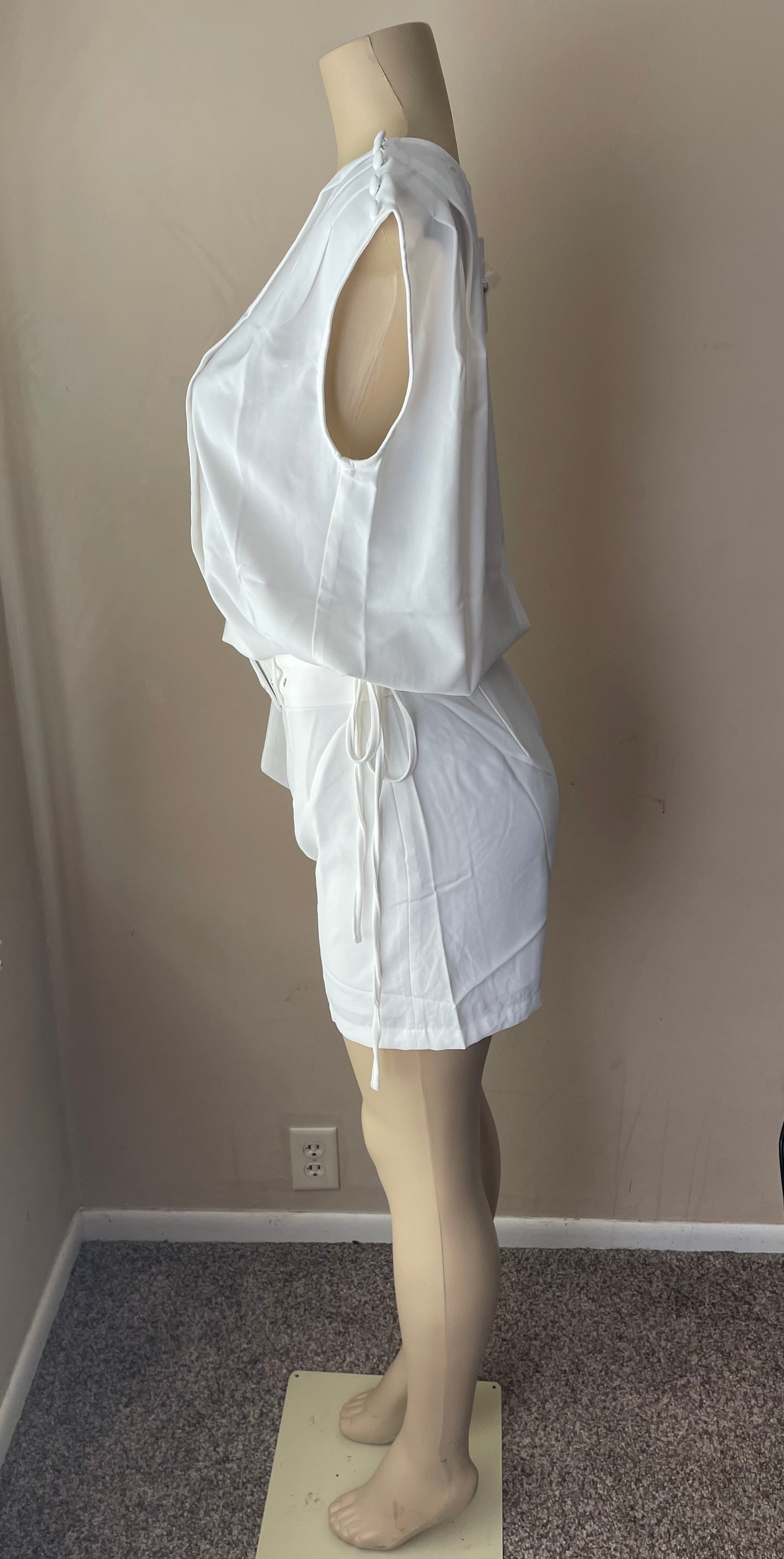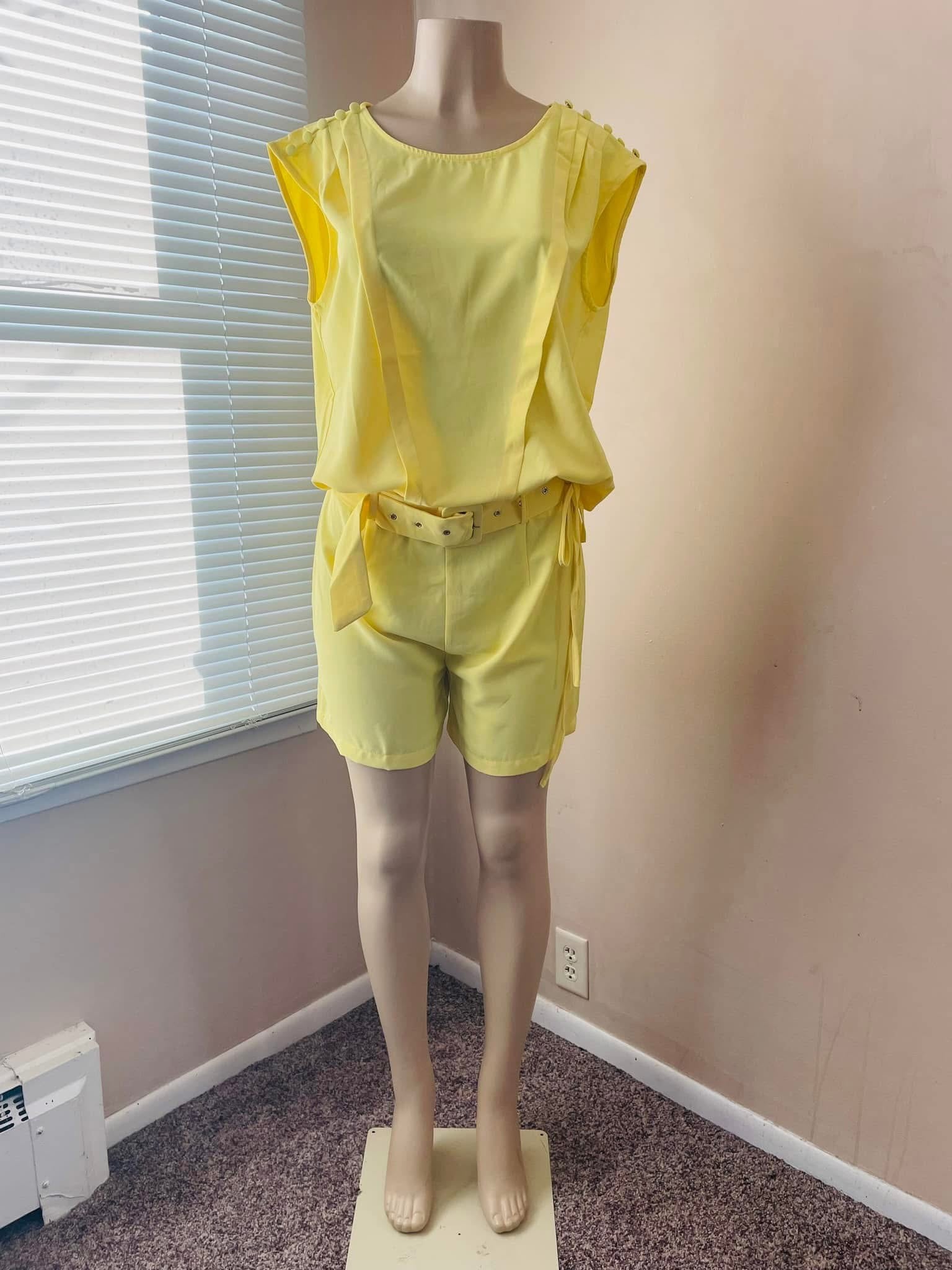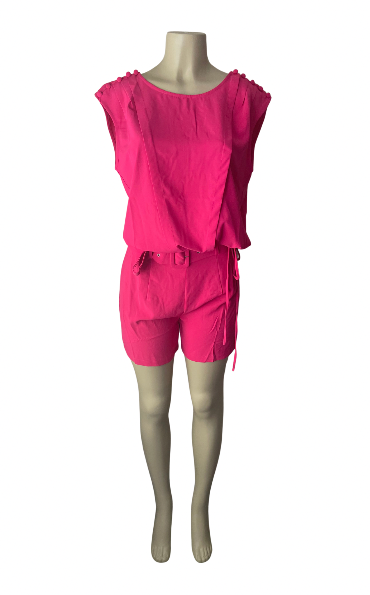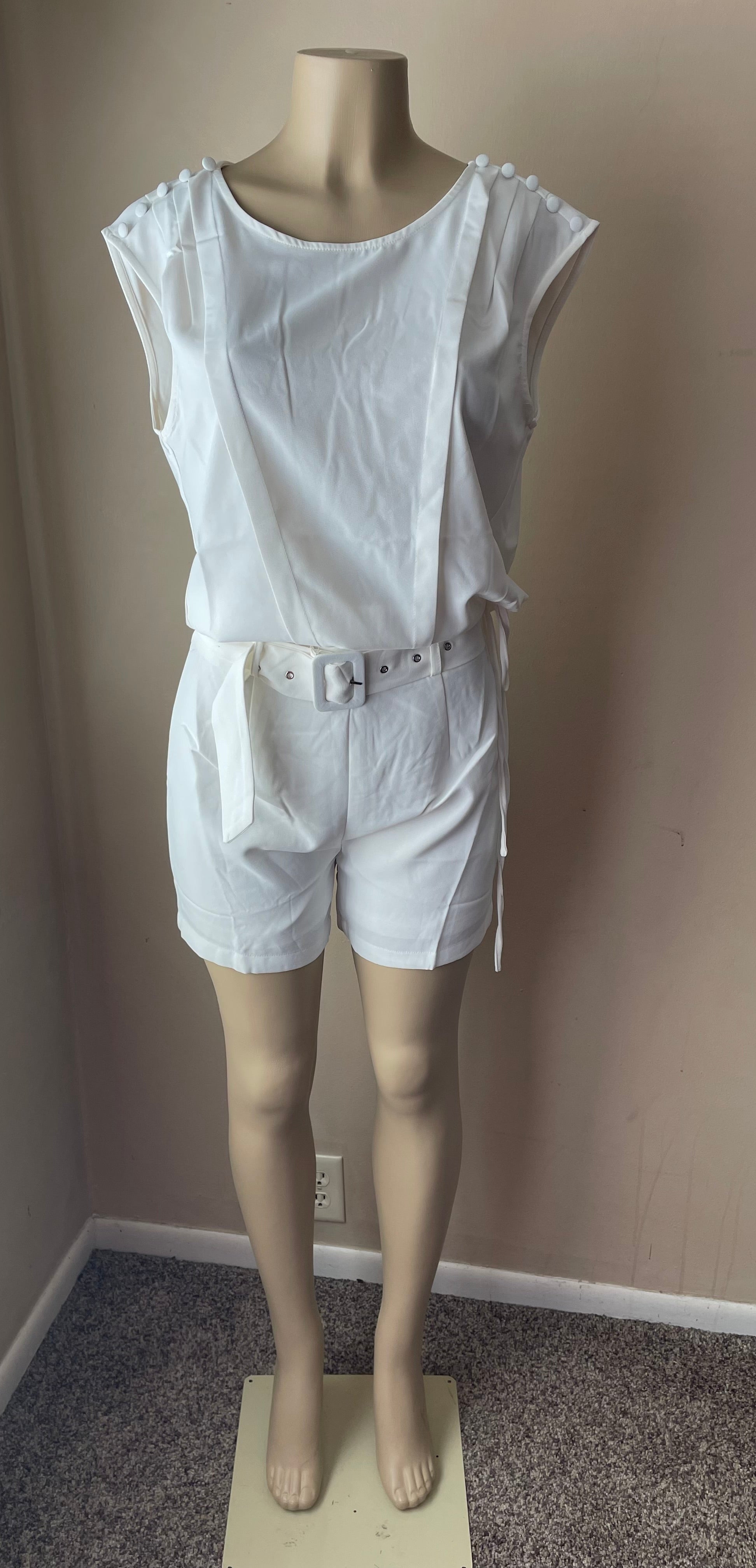 The set comes with shorts with a winged closure and a belt. The blouse is adjustable from the bottom and has buttons on the shoulders, but it comes as an accessory. The set is not stretchy, it is made of cool fabric